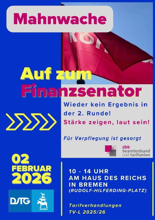 Wir beabsichtigen daher gemeinsam mit dem dbb Bremen und der DPolG am 2. Februar 2026, in der Zeit von 8:00 – 14:00 Uhr eine Mahnwache und ab 12:00 Uhr eine aktive Mittagspause auf dem Rudolf-Hilferding-Platz vor dem Dienstsitz des Senators für Finanzen durchzuführen.